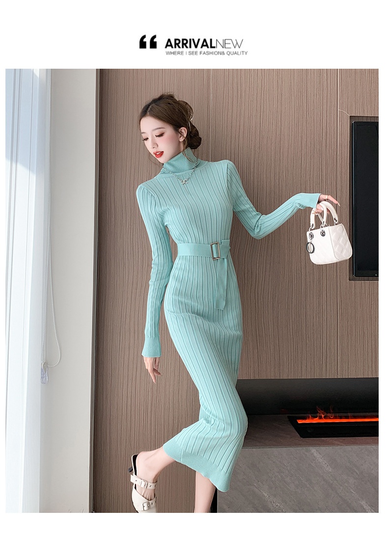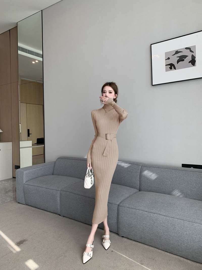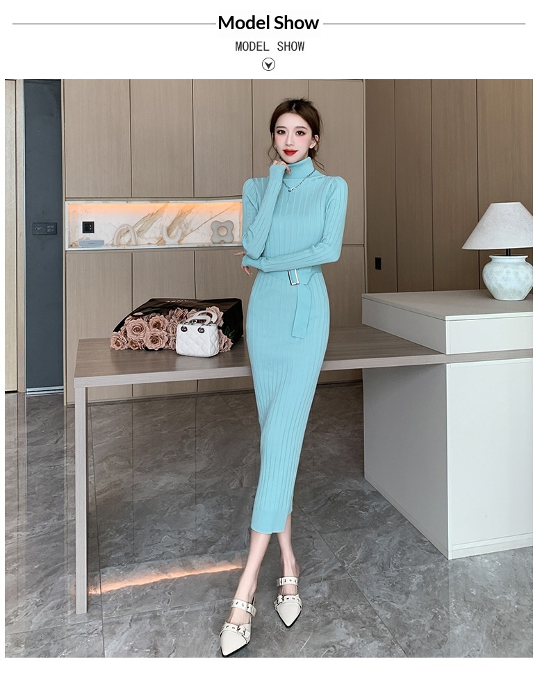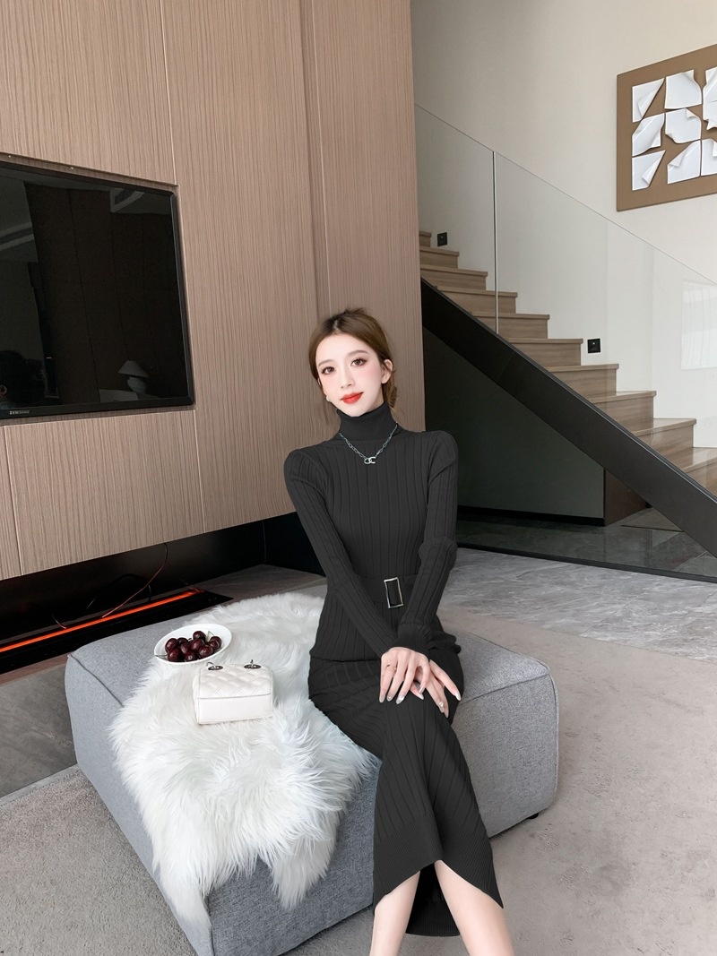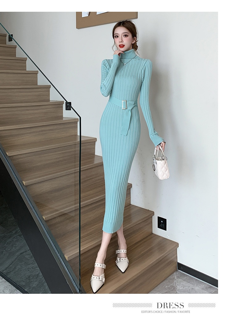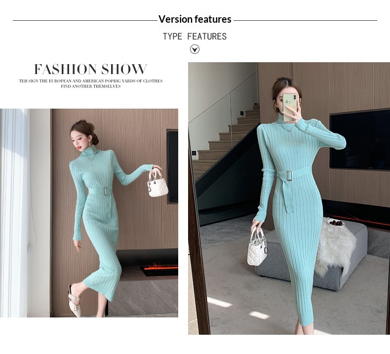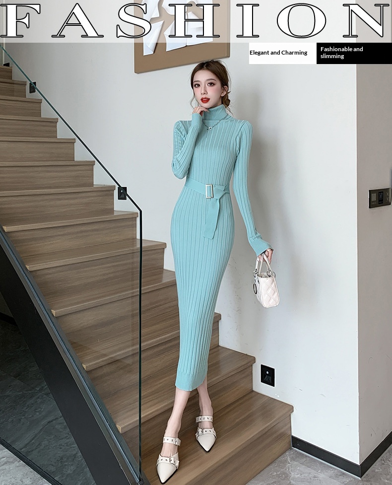 Elegante suéter de cuello alto combinado con un vestido de punto elástico, ajustado y de cintura alta.