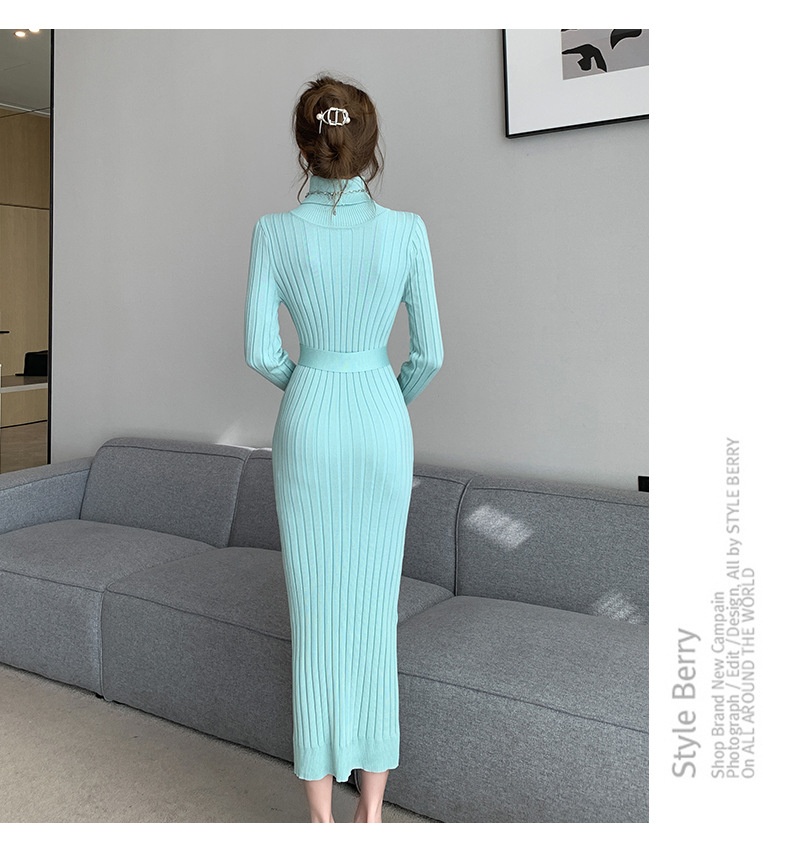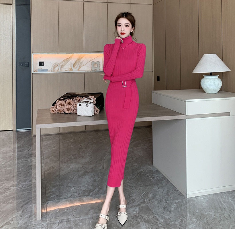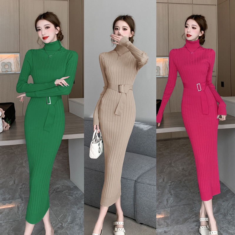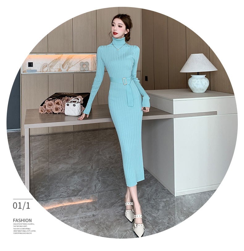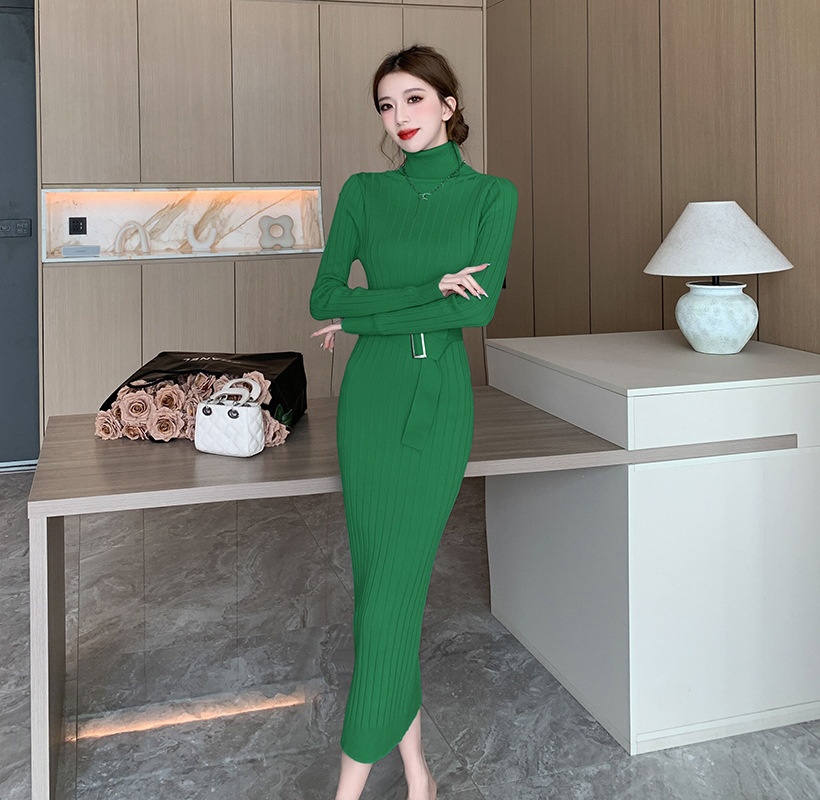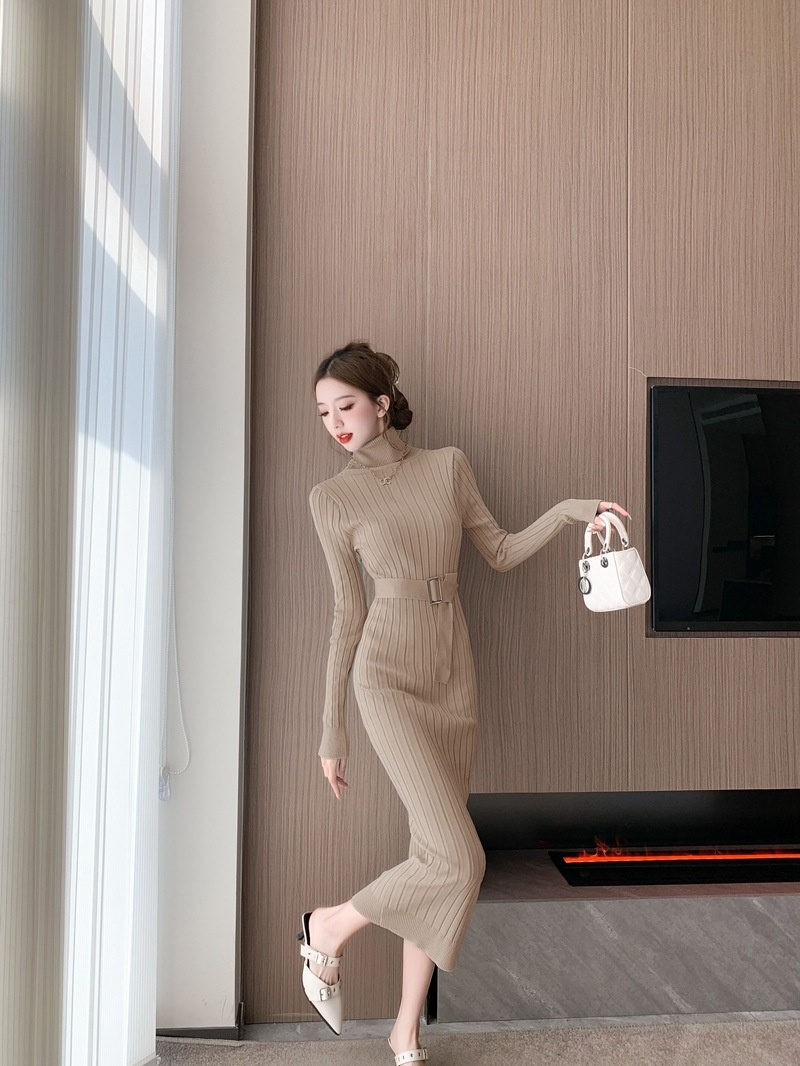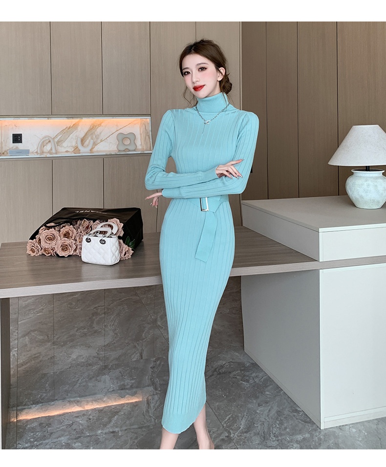 Elegante suéter de cuello alto combinado con un vestido de punto elástico, ajustado y de cintura alta.