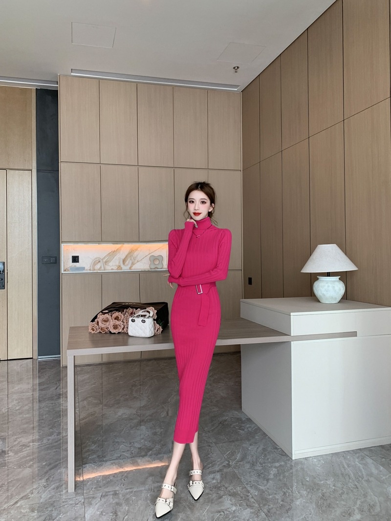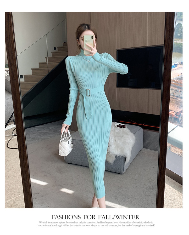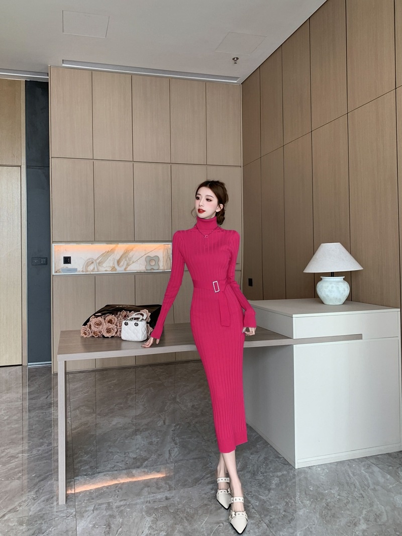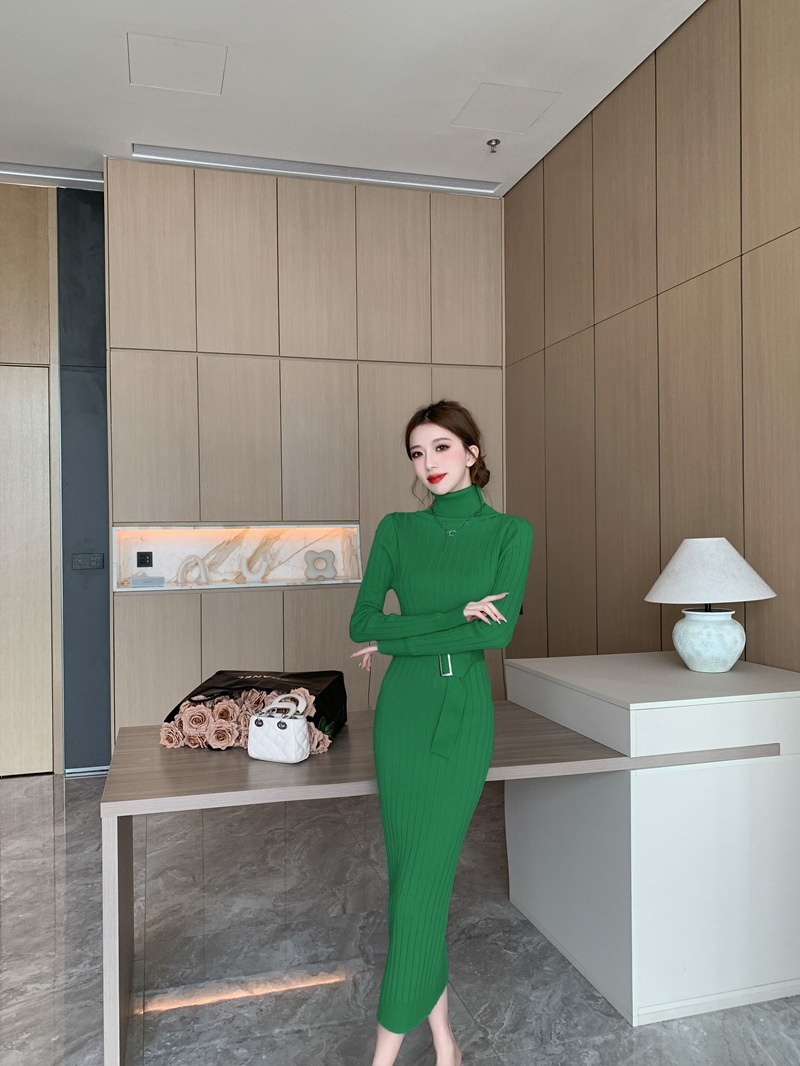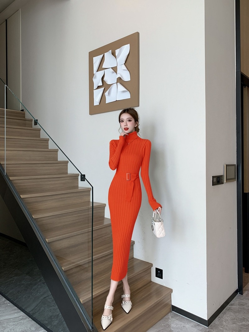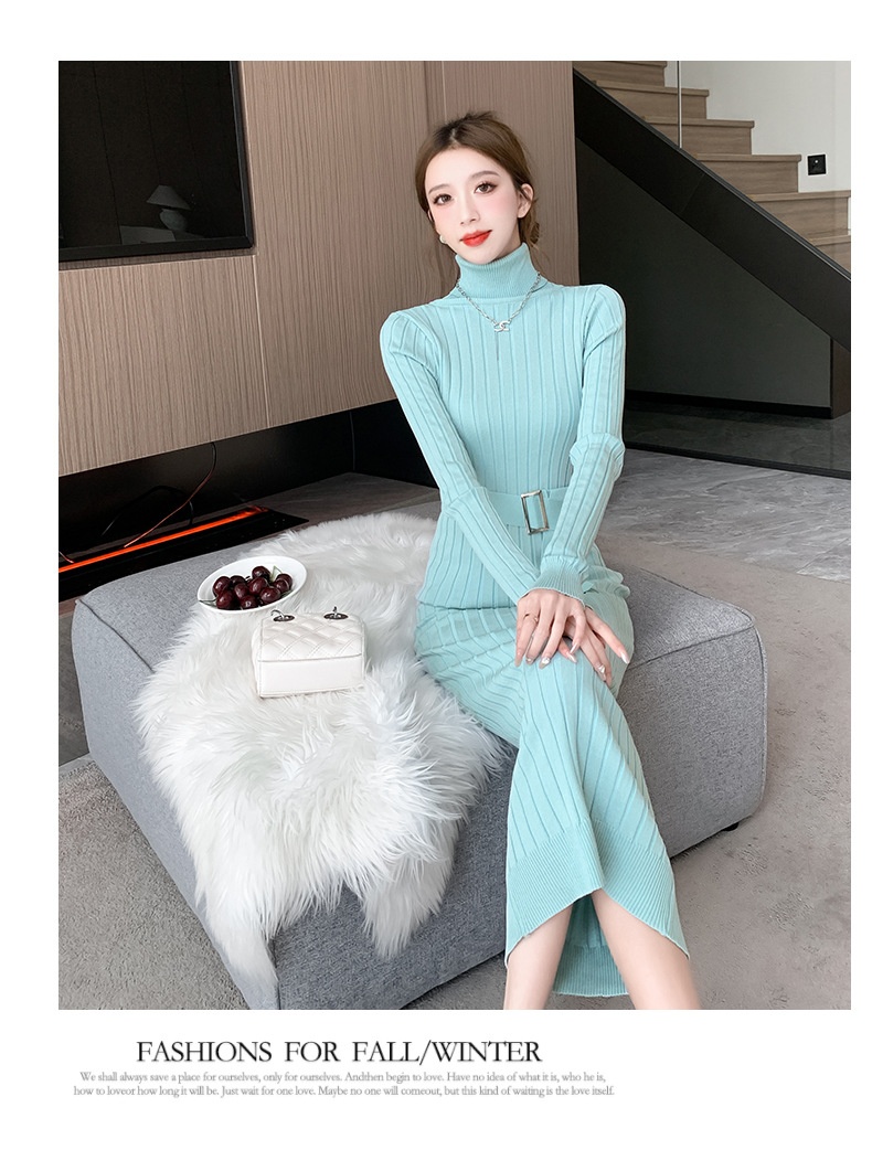 Elegante suéter de cuello alto combinado con un vestido de punto elástico, ajustado y de cintura alta.