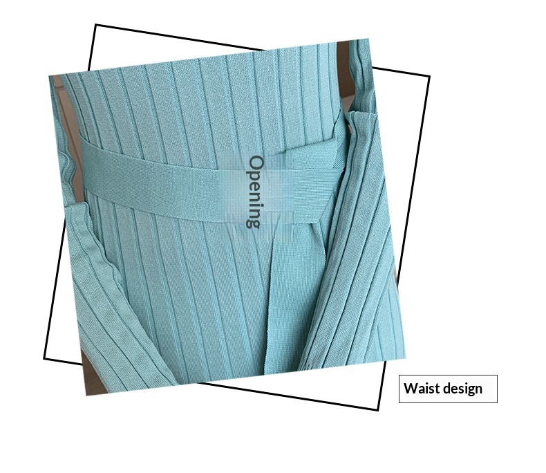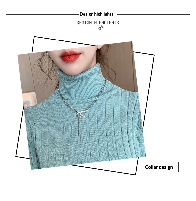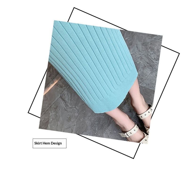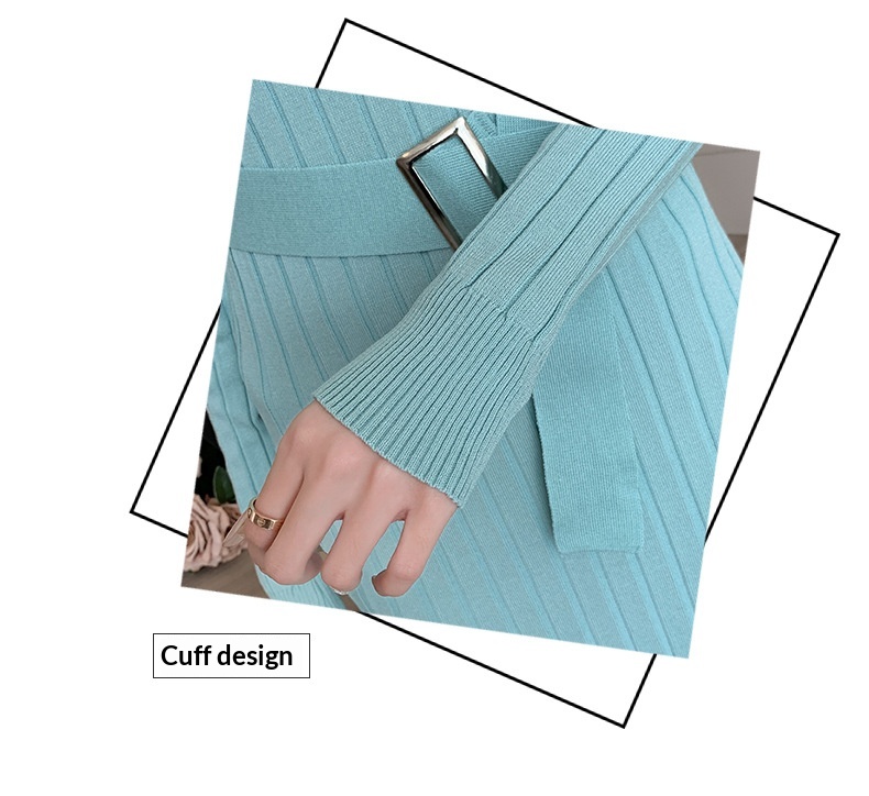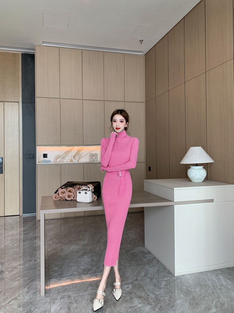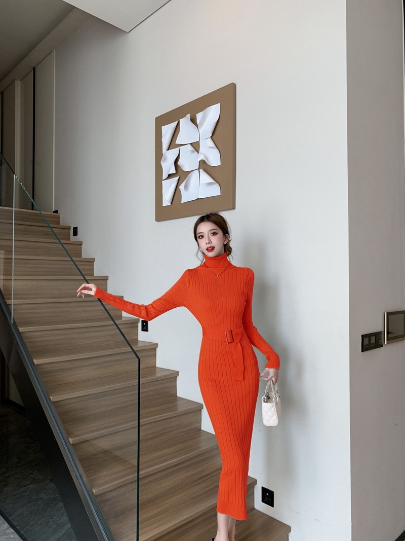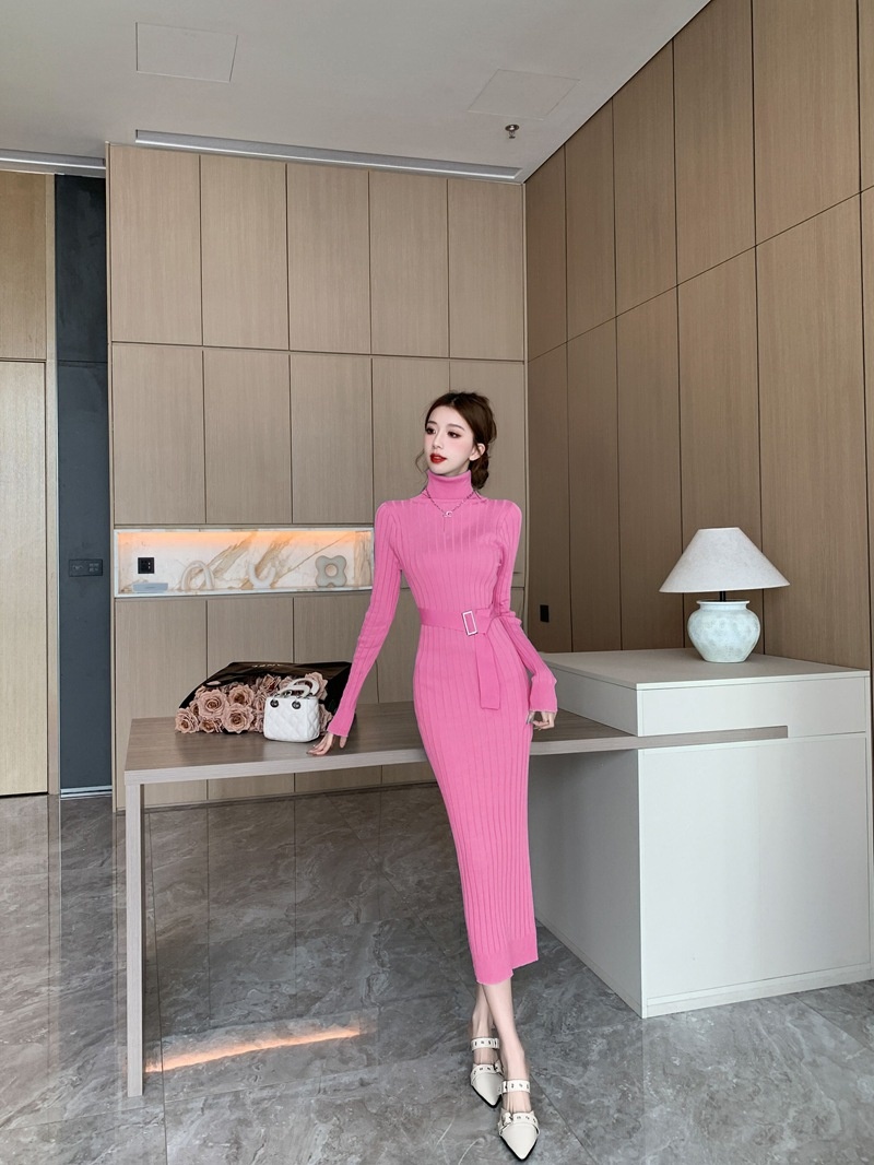 Elegante suéter de cuello alto combinado con un vestido de punto elástico, ajustado y de cintura alta.