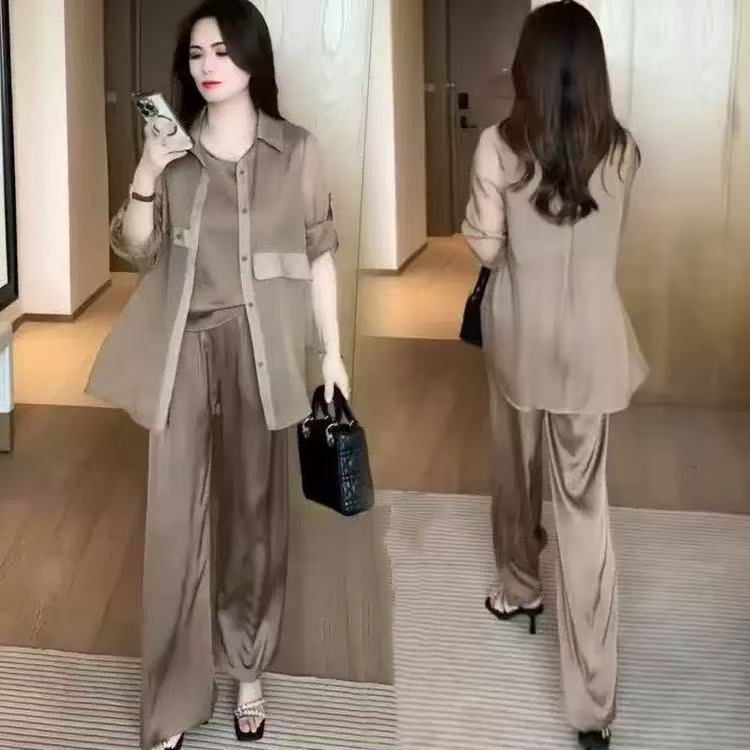 Conjunto informal de tres piezas para mujer: camisa de protección solar, pantalón de pierna ancha y traje de protección solar.