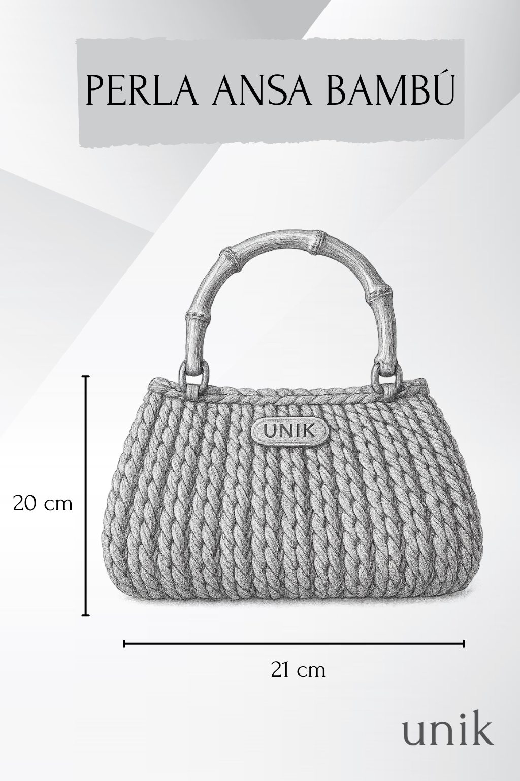 . Mides: 20 x 21 cm · Fil nàutic · Botó magnètic · 2 anses de bambú · Cadena metàl·lica daurada · Etiqueta Unik |