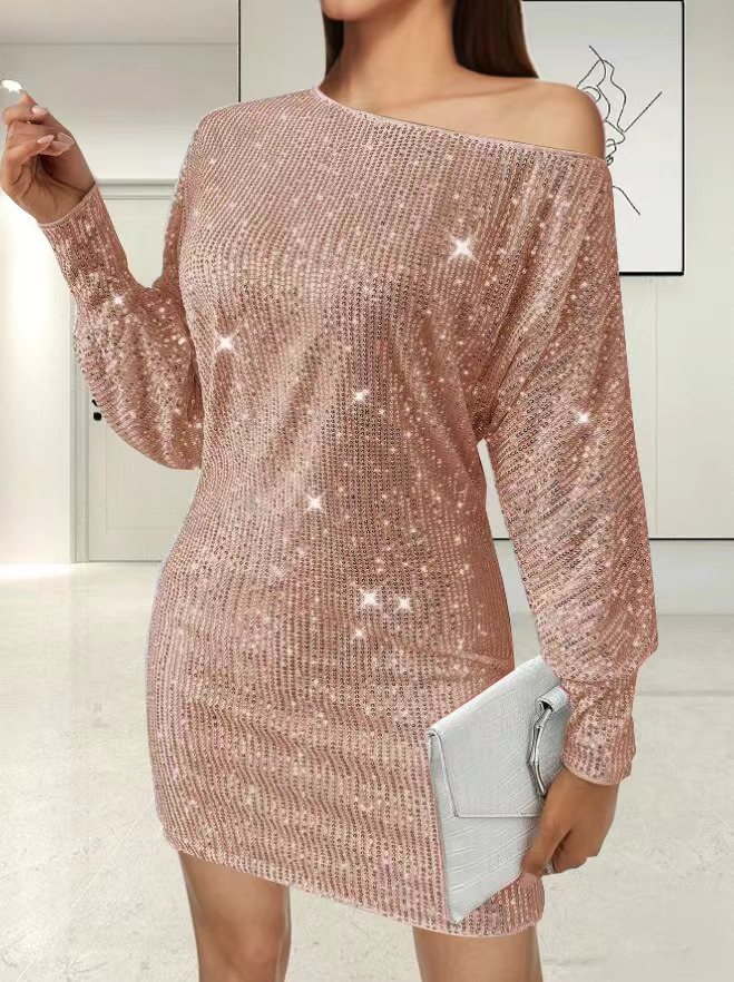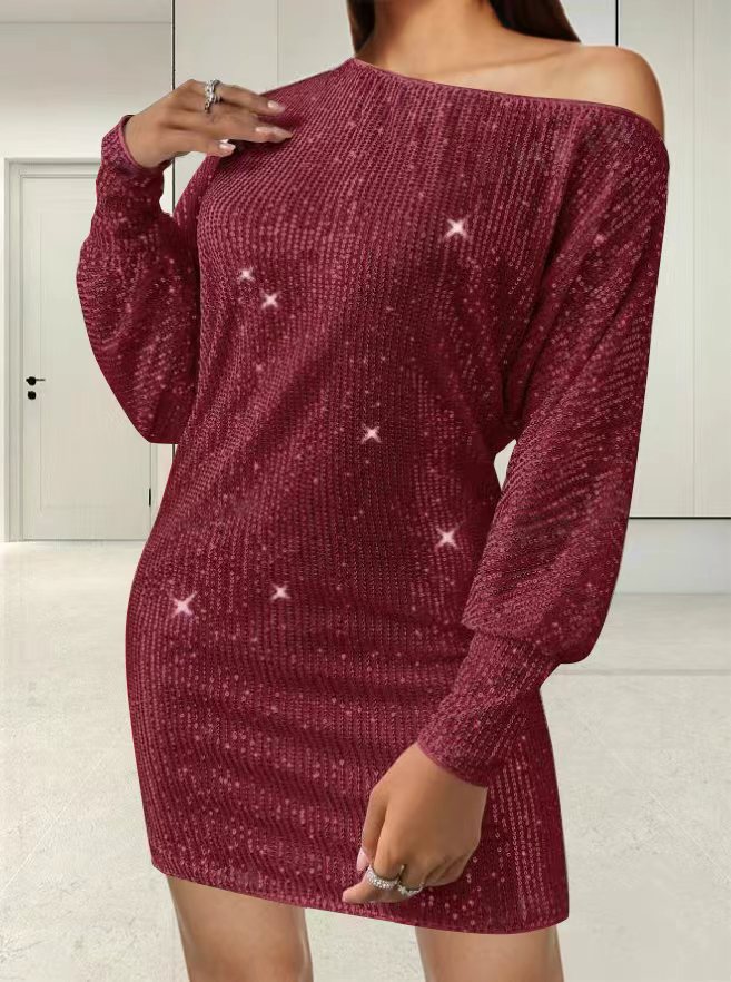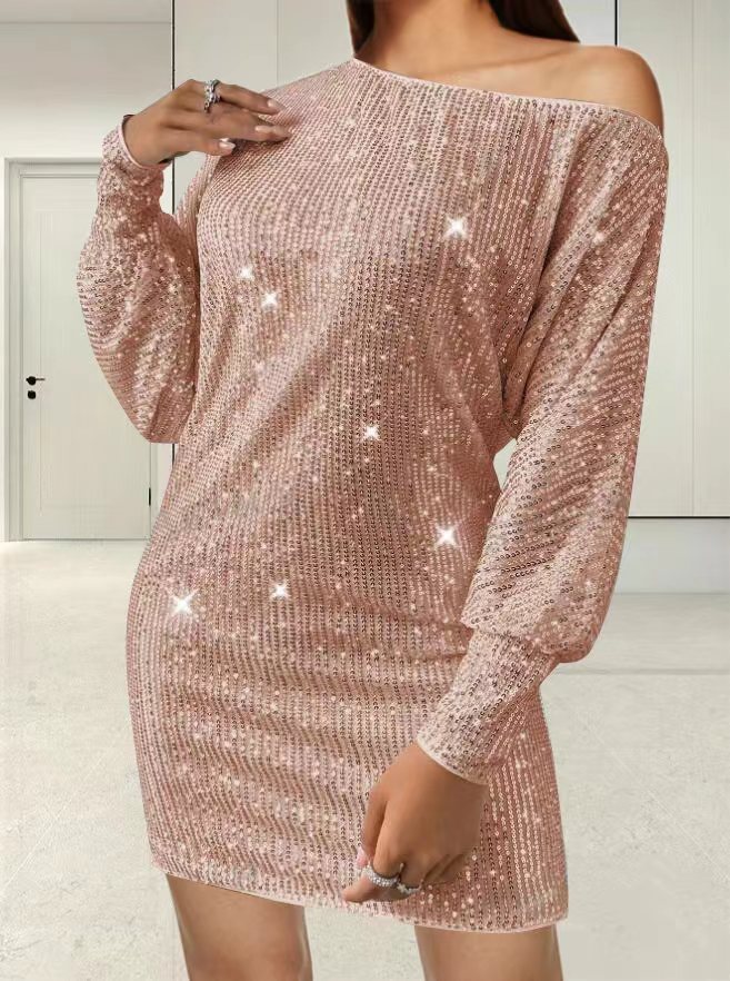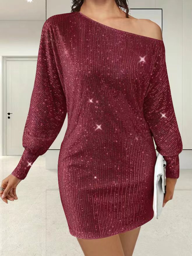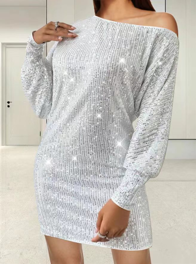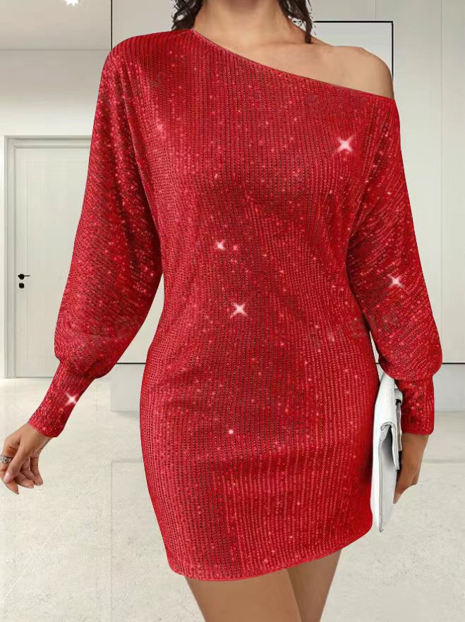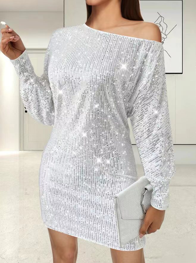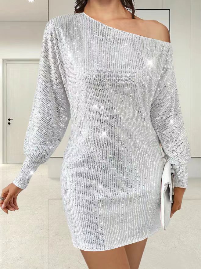Vestido sexy de lentejuelas de manga larga con bajo asimétrico y un solo hombro